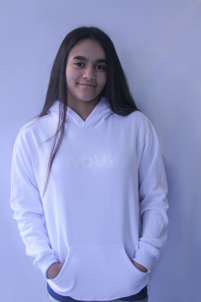 Moletom Canguru com touca branca Al'fa Volk, com estampa frente e costas.